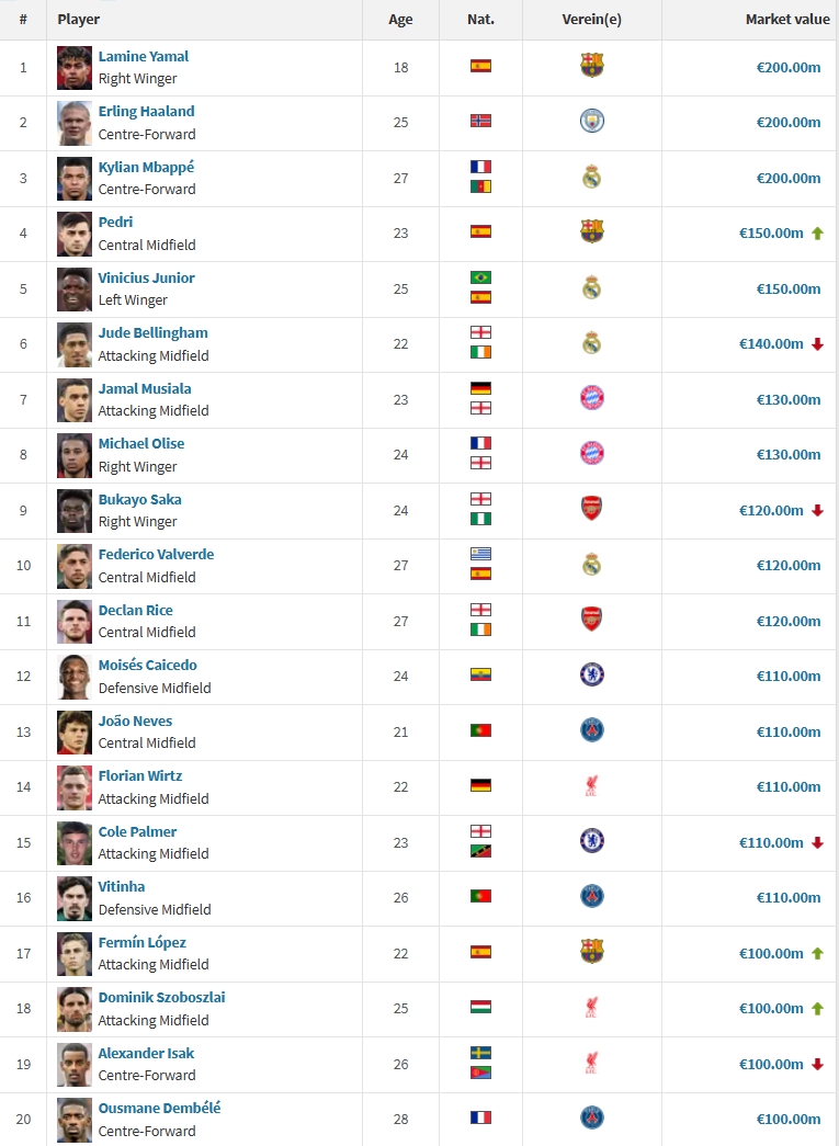 开云体育-足坛20位亿元先生:费尔明新晋 亚哈姆2亿 英超8人西甲7人意甲0人